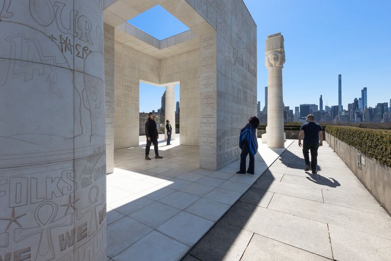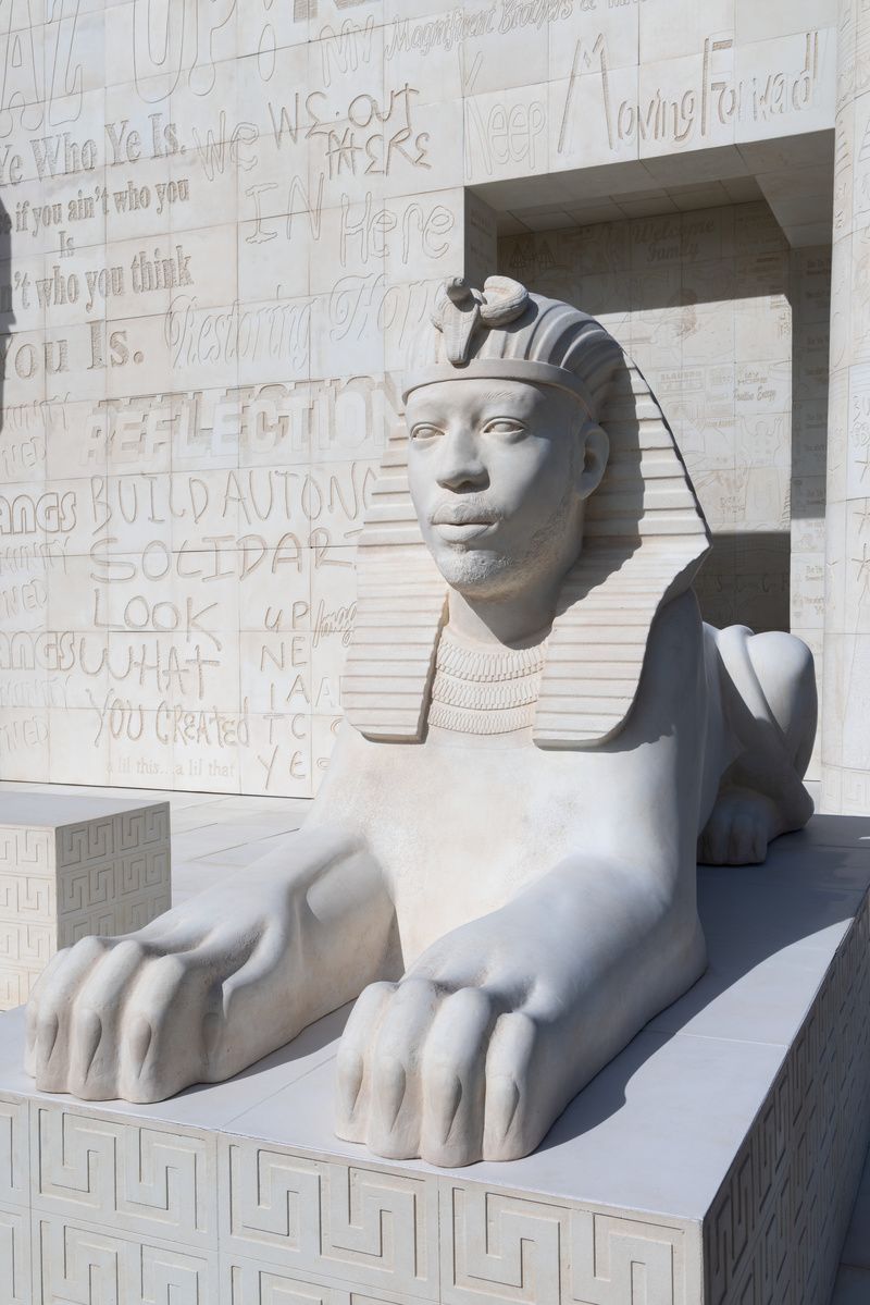 The installation is made up of a 22-foot-high cube constructed of 750 glass fiber-reinforced concrete tiles. The temple-like cube is guarded by two sphinxes and surrounded by four towering columns. The faces on the two sphinxes are those of the artist’s mother and brother. The walls of the cube and the columns are covered in words and images from the proverbial “Book of Everyday Life,” inspired by the Egyptian “Book of the Dead.”