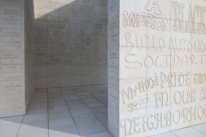 The carvings on the walls and columns represent bits of life observed in the historically Black neighborhood of South Central Los Angeles. These phrases and pictures that Halsey collected serve as a sort of archive of her community, presented here in the manner of ancient Egyptian hieroglyphics. On the piece, you’ll see text that looks like graffiti, depictions of local buildings, and symbols of life in Los Angeles.