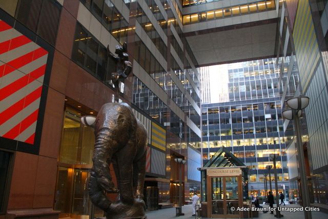 The end (or the beginning) of 6 1/2 Avenue brings you to the arcade of the AXA Building at 787 Seventh Avenue, between 51st and 52nd streets. This arcade connects two streets while also inviting people to look around or sit down. Barry Flanagan’s sculpture “Young Elephant” is the bonze centerpiece of this dynamic space. The colorful walls with stacked and jutting layers of windows makes you want to walk through and examine the arcade at all angles. Lunching on one of the solid stone benches inside this geometric space feels a bit like sitting inside a Rubik’s Cube. In a good way. And because it is so open with are no obstructing tables, people walk through at all hours, making it a prime people-watching spot.