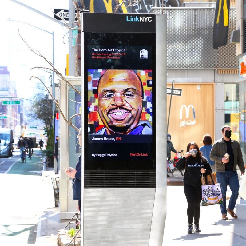 The Mayor’s office hosted a citywide day of remembrance on the one-year anniversary of the first known COVID-19 death in New York (March 14, 2020). Many of the photographs projected onto the Brooklyn Bridge were taken from the Missing Them project, with permission from families. All over New York City, there have been other memorials as well. In honor of World Health Day, LinkNYC partnered with ARTHOUSE.NYC to present The HERO ART PROJECT which honors medical providers from around the world who have lost their lives while fighting COVID-19. In the subway, the MTA created a digital memorial in honor of the 136 employees who have died from COVID-19.