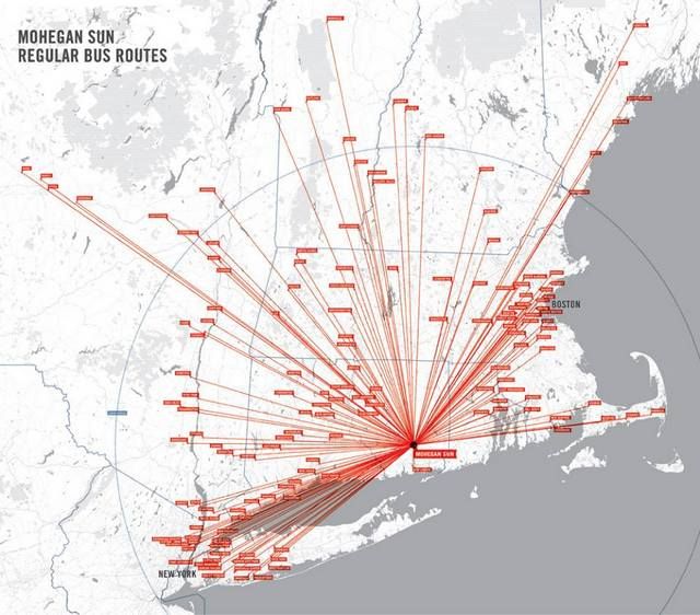 Diagram showing bus routes connecting the Mohegan Sun to towns all over the Northeast. Credit: Stephen Fan and Shane Keaney