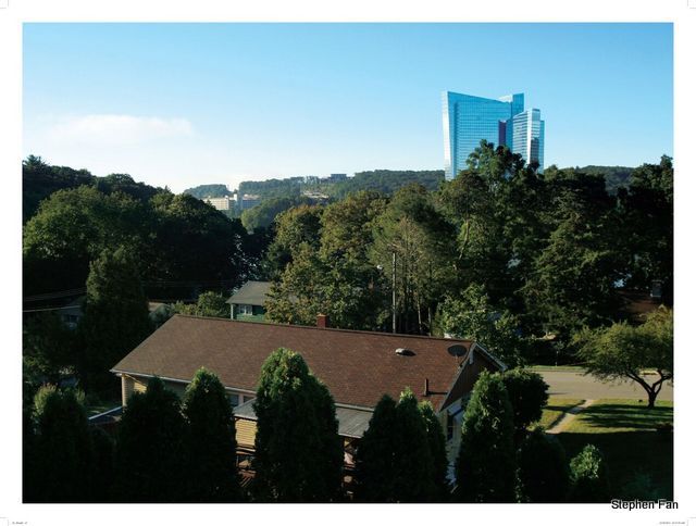 The Mohegan Sun casino rises behind suburban ranch houses in Connecticut