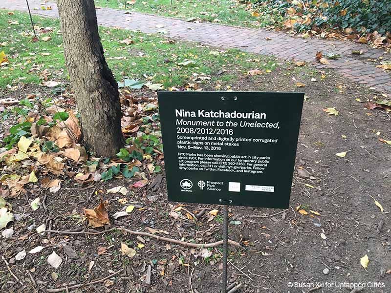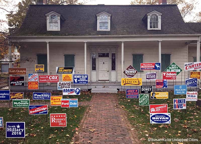 A blue and white campaign sign erected on the front lawn of the Lefferts Historic House proudly proclaims “I’m with Hillary 2016.” It is one of many currently decorating the front lawn of the Lefferts Historic House inside Prospect Park, placed there by artist Nina Katchadourian. Her piece, “Monument to the Unelected,” features lawn signs for all 57 candidates who ran for the United States Presidency and lost, beginning with John Adams in 1796.