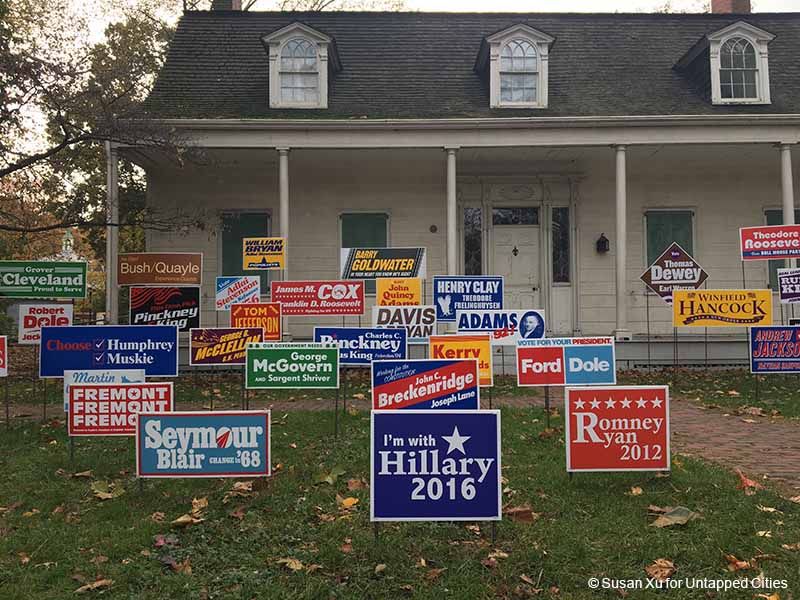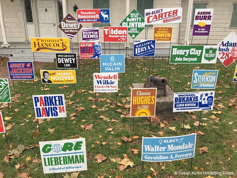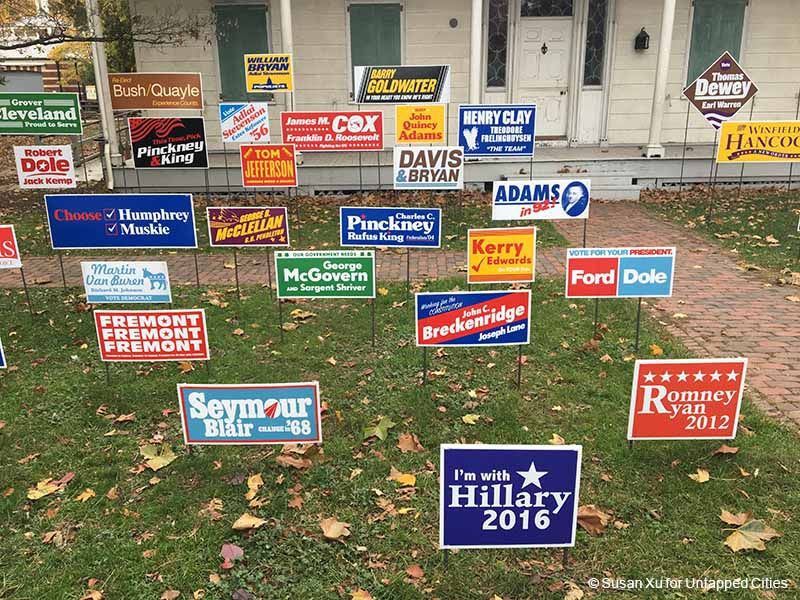 At 12 p.m., on the Wednesday following Election Day, Katchadourian added her newest sign honoring Clinton, as defeated Democratic Party supporters removed their own campaign posters and signs from their homes. Katchadourian, who designed each sign from scratch using corrugated plastic sheets (none are historically accurate), began the project in 2008 after being commissioned by the Scottsdale Museum of Contemporary Art in Arizona. Since then, she has presented the piece every election cycle to present “a view of the country’s collective political road not taken.”