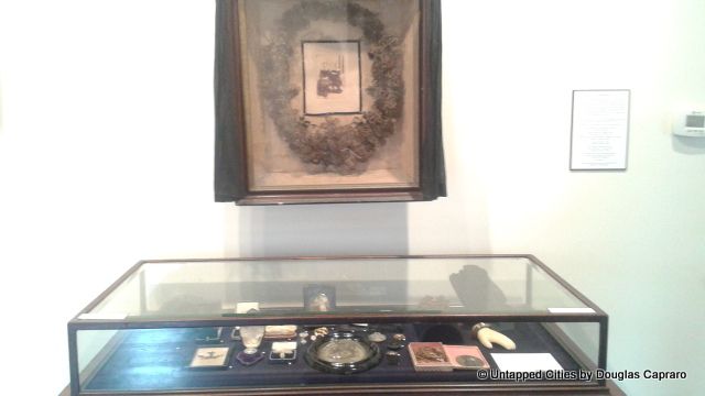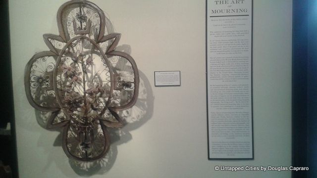 Notable among the collection of oddities in this exhibit are a series of memorialized photographs of deceased children in open caskets, a form of mourning from the 19th century that was only affordable to the wealthy (children died more frequently at that time due to illness and a lack of proper medical knowledge). Other artifacts in the exhibit include a variety of ornamental wreathes and mementos that were partially constructed from the hair of the deceased. These inventive mourning practices are all beautiful to behold and are indicative of a time when mourning was indeed an art form.