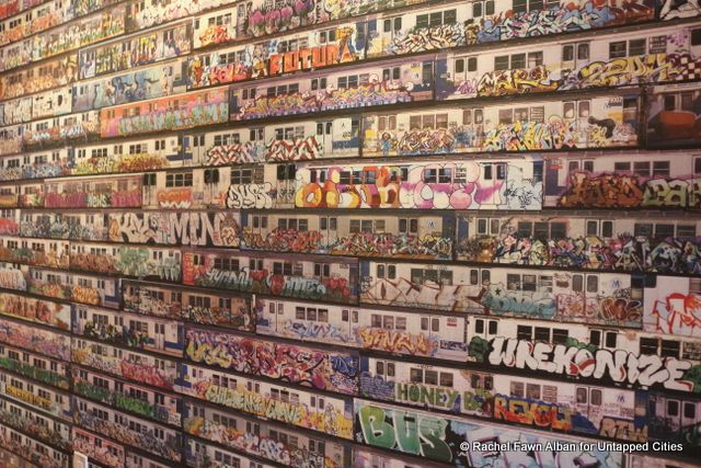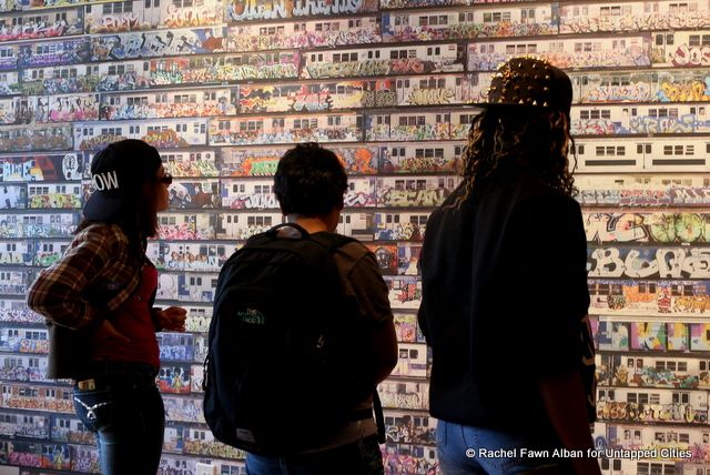 Moving Murals features Henry Chalfant’s photographs of graffiti-covered subway trains and Martha Cooper’s portraits of the artists, who were young teenagers at the time. Approximately 840 of Henry Chalfant’s train photographs are displayed as a mosaic which lines the wall of the gallery. This installation has great impact, and we had fun exploring the colorful murals. Meanwhile, a selection of Martha Cooper’s portraits of the artists offers viewers a rare glimpse into the rail yards where graffiti writers would practice their craft.