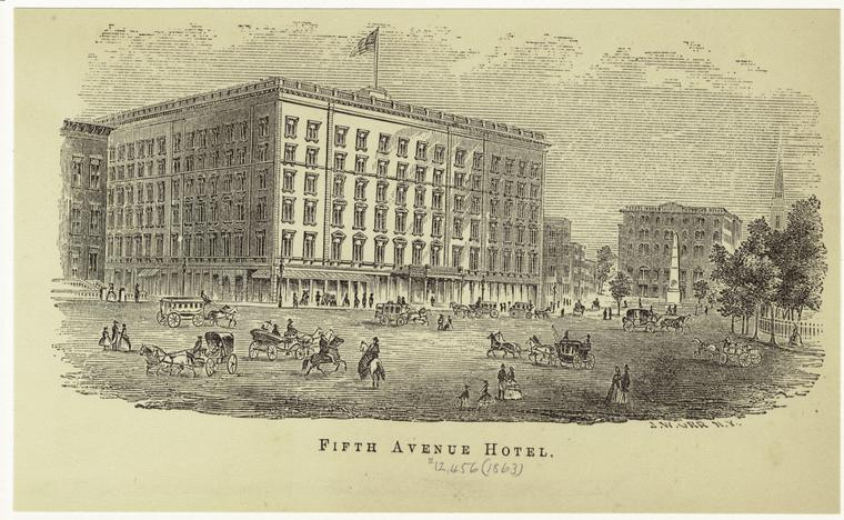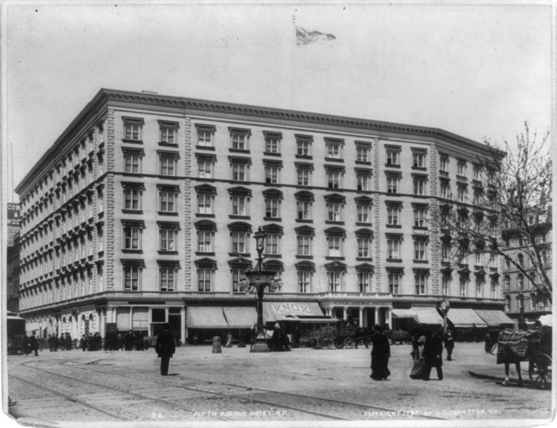 The Fifth Avenue Hotel was one of the grandest hotels in New York City. The land was originally part of Matthew Horn’s farm. By the 1830s when Fifth Avenue cut through the land, the farm gave way to the Madison Cottage, which charged six pence for supper and forbade more than five men from sleeping in one bed. In the 1850s, the Madison Cottage was demolished for Franconi’s Hippodrome, which in turn was replaced by the Fifth Avenue Hotel in 1859. The Fifth Avenue Hotel played host to a bevy of foreign dignitaries including, the Prince of Wales, in 1860, Done Pedro, the last emperor of Brazil, the Crown Prince of Siam, and Prince Napoleon. The Fifth Avenue Hotel was also demolished, replaced by the International Toy Center Building, which is now home to Eataly.
