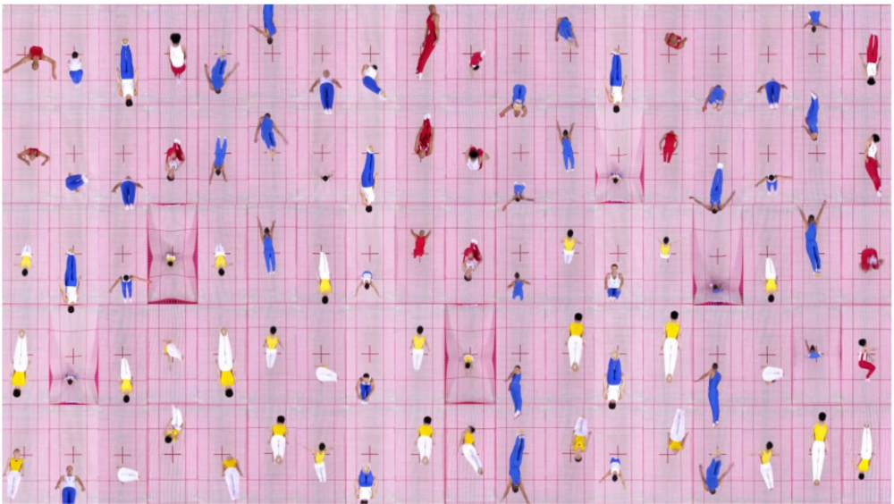 are the latest batch of artists to create works for the world’s largest, longest-running digital art exhibition. For three minutes every evening, their work will take over 92 electronic billboards at the Crossroad of the World. For the month of June, artist Yuge Zhou's Trampoline Color Exercise will fill the screens with a moving-image collage of leaping gymnasts whose uniforms and identities shapeshift as they flip and tumble on pink gridded trampolines. These images were crafted by manipulating aerial vantage points of archival Olympic Games footage.