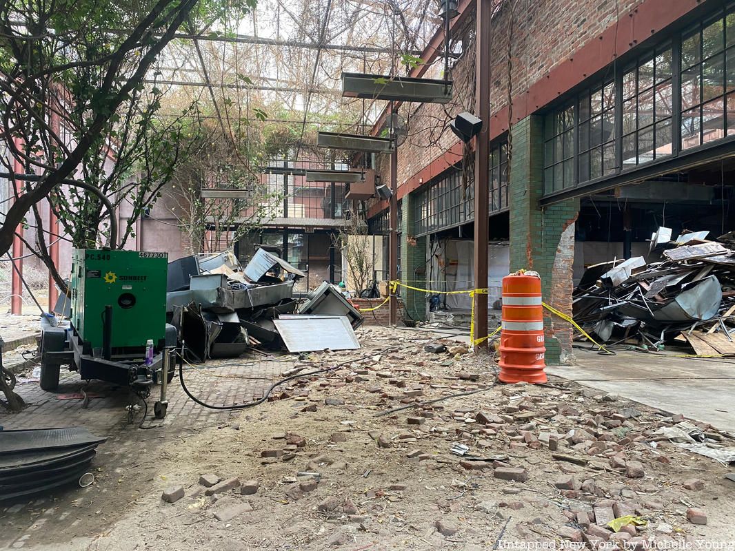 A 10-story building with ground floor retail has been planned to replace the original structure which had been built in 1950, but looking at New York City Department of Building filings, most of the job filings since last October have been disapproved by the agency or withdrawn by the owner. One permit that was successfully issued was for removal of non-load bearing interior walls, ceiling finish, bars and flooring — leaving it to the state it is in today. The delay on approvals and the onset of the coronavirus pandemic has meant that the interior trees and vines which once created for a lush interior on the first floor and canopy on the upper floor is growing naturally, like an urban jungle. The striking view can be seen through the construction barriers on the front facade.