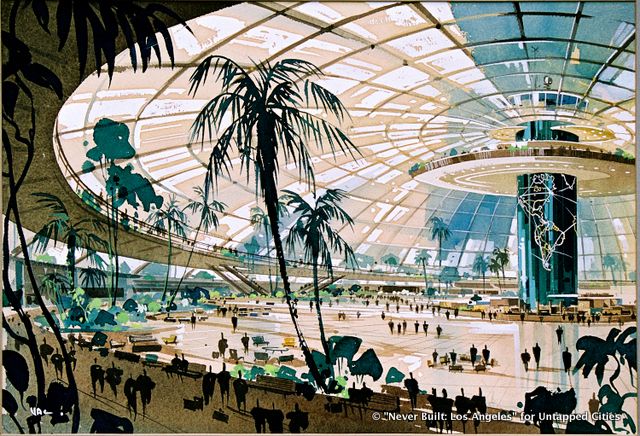 SL: Yeah, the plan was by an architecture firm called Pereira & Luckman that was going to be a whole glass dome over LAX, the whole thing was going to have little fingers, satellites, sticking out. Then, later plans had helicopters attached to buses going between LAX and downtown. They would also have underground terminals that would have been lifted up using hydraulics. A whole island planned for LAX off of Santa Monica bay.