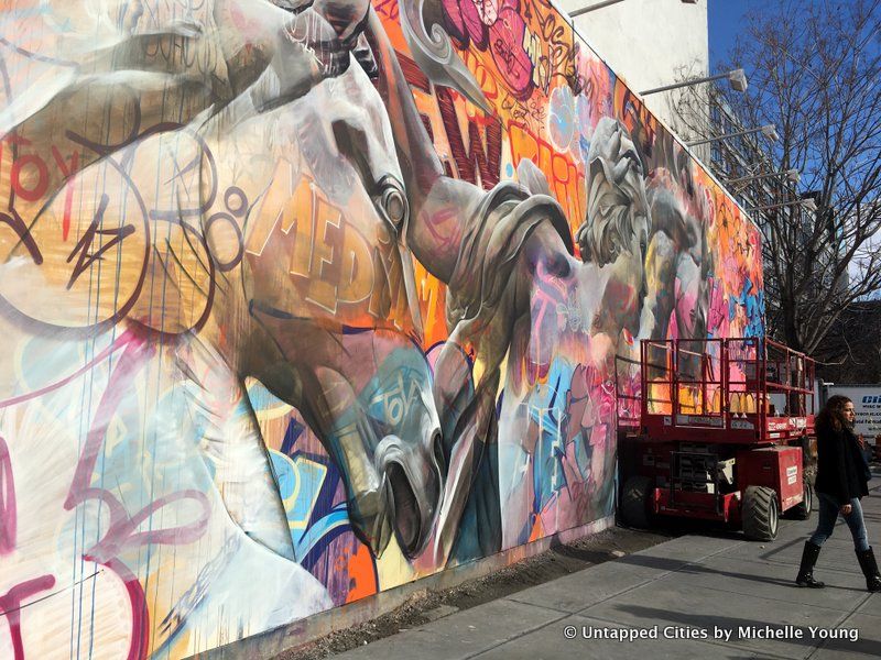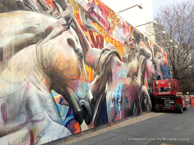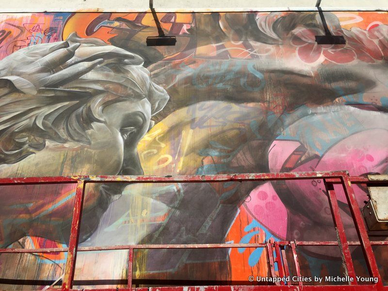 The new piece on the Bowery Mural is starting to take shape. “Urbanmythology” is by Spanish street artists Pichi&Avo, who will follow Logan Hicks’ popular, Instagram-friendly piece, Story of My Life. Pichi & Avo are known for their distinctive works that meld Neoclassical figurative painting with more traditional tagging and a touch of surrealism. The work isn’t completed yet, but scroll down for more photos and see some completed works by the Pichi & Avo from other cities.
