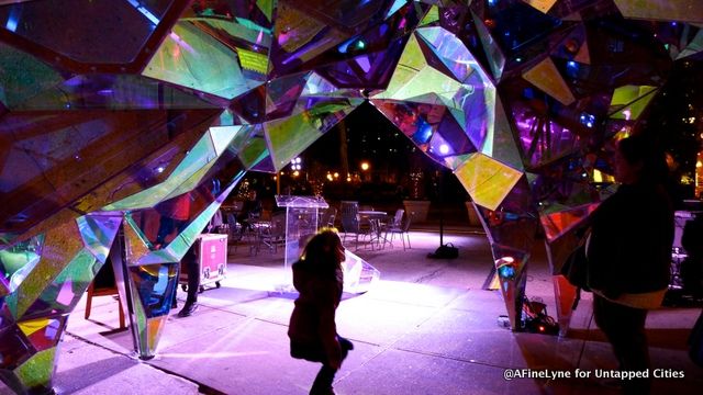 Nova utilizes the placement of scopes, which each point to a distinct landmark the Flatiron Building, Met Life Tower clock tower, Empire State Building, and other buildings in the area. By using a mix of optical materials, including 3M Dichroic Film, the design creates a human scale kaleidoscope. While we were there, kids of all ages were running through, and twirling around inside creating an array of colorful reflections.