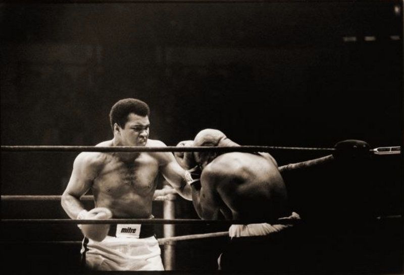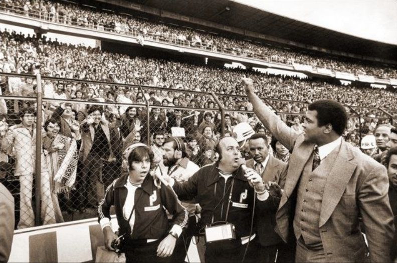 Gaffney began as a newspaper photographer and his time with Ali came as “fateful thing” at 25 years old, he tells us. Gaffney was in Deer Lake, Pennsylvania on a freelance assignment taking pictures of Ali in his camp. He realized, “I’d follow this guy his whole career.” The clinching moment seems to have come when Gaffney was challenged by Ali “to run up his mountain. His words were ‘No man alive has run up my mountain.'” It was 5:30 in the morning. Halfway up, Gaffney was struggling but he says suddenly, “It was like words coming into me that were telling me, you can’t stop running. This is the heavyweight champion of the world lighting the way for you to run up his mountain and I kept going and I made it to the top.” When Gaffney was ready to head out a few days later, Ali asked him to work for him. His friend and personal photographer was running for Congress and Ali told Gaffney, “I’ll make you an offer you can’t refuse,” a big phrase two years after the release of the Godfather, Gaffney jokes.