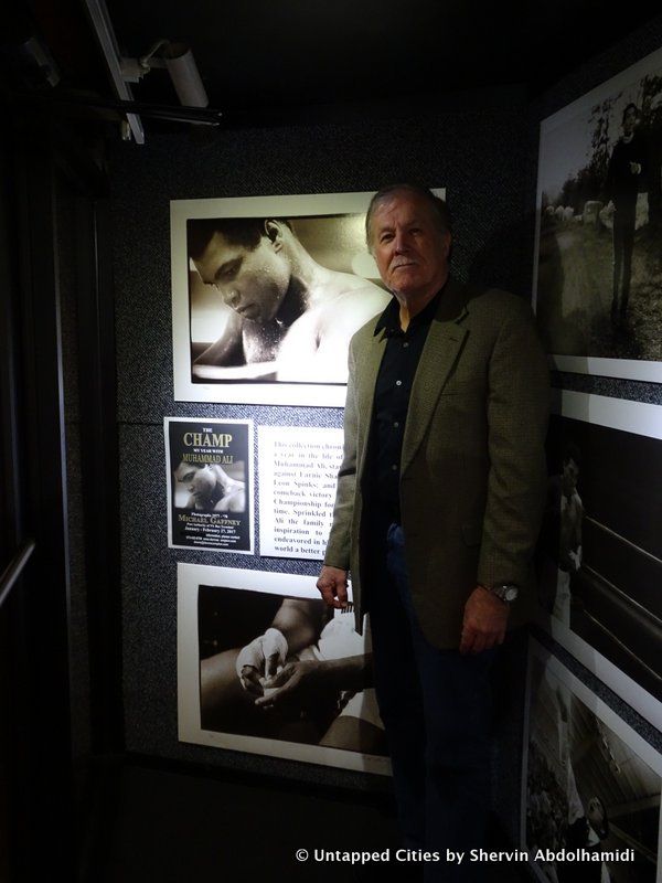 Did you know there’s an art gallery inside the Port Authority Bus Terminal? Well, there’s a timely new exhibit on Muhammad Ali presented by the Donna Compton Gallery, timed with his birthday yesterday and Black History Month in February. It features 64 photographs from the book The Champ: My Year With Muhammad Ali by photographer Michael Gaffney who was the boxer’s personal photographer between 1977 and 1978. Gaffney took more than 8,000 photographs that year showing not only Ali the fighter but also him as a family man, philanthropist and thinker. In fact, Gaffney says that what Ali valued most was his alone time with his children.