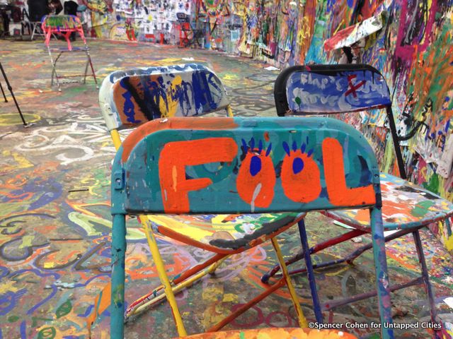Upon entering the Pawel Althamer: The Neighbors exhibit at the New Museum a mural of paint surrounds you as artists work. They are clad in once white smocks, now vibrant messes of color. But these are no ordinary artists, as hints are lain by the inviting paint cans with brushes spewed in the center. The artists are museum patrons, with the museum visitors applying layer upon layer of paint forming a vast vibrant mural of seamless chaotic color. A vast array of small designs–many half covered–are discernible, from targets to faces to lettering. “FOOL” is written boldly across the top of a chair, while “OLLIE” adorns a wall.