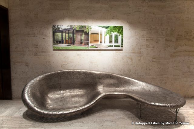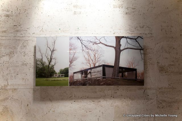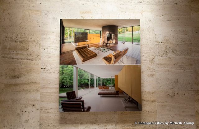 Although the Picasso tapestry at the Four Seasons Restaurant is now on display at the New York Historical Society, the iconic restaurant in New York City’s Seagram Building has offered yet another reason to stop by. A new exhibit, Side by Side by photographer Robin Hill launched yesterday, and for architectural fans it’s a must-see. The Seagram Building by architect Mies van der Rohe is a fitting backdrop, as Philip Johnson designed both the interior of this Park Avenue skyscraper as well as the Glass House in New Canaan, Connecticut. But the juxtaposition of the Glass House and the Farnsworth House–at least in such a formal study–is new.