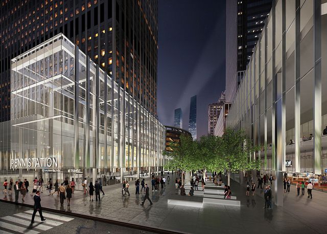 The 33rd street entrance to the Empire Complex Station at night, with proposed skylights