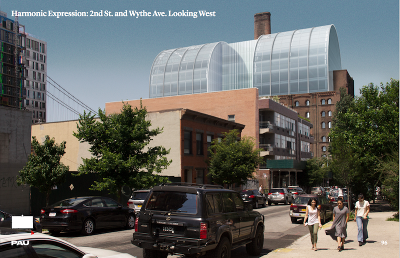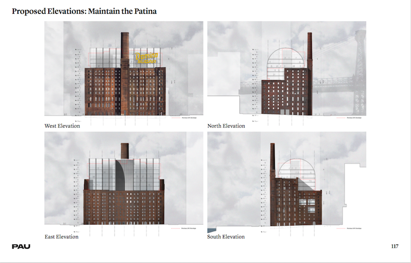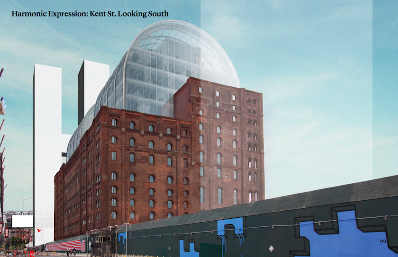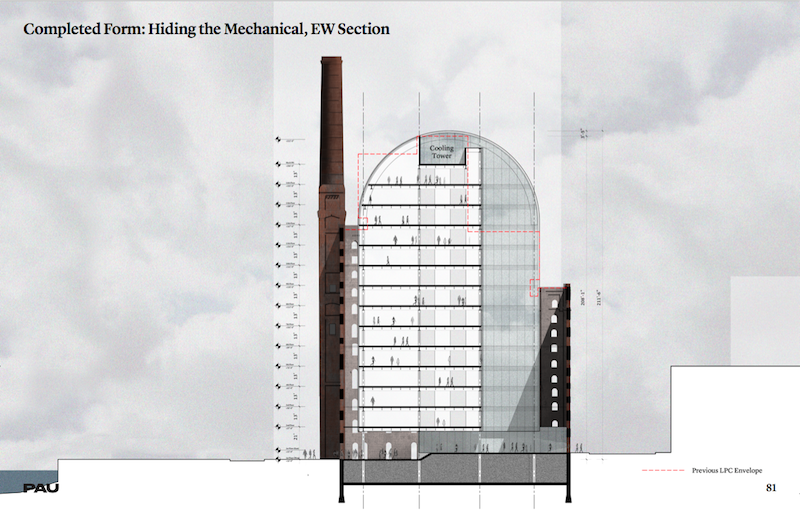 The renderings below have been released ahead of a presentation in front of the Landmarks Preservation Commission which is being held today. The dome completes the building, creating it into a single monumental structure. The vaulted barrel shape sits begins inside the structure, sitting inside of it without touching the factory’s historic walls.