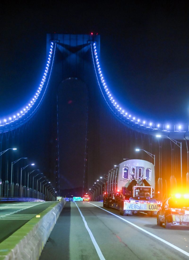 These first five cars were transferred from the South Brooklyn Marine Terminal to Staten Island overnight via flatbed truck. Once secured to the truck beds, they traveled over the Verrezzano Bridge to their destination where they’ll undergo final preparations before being put into service.