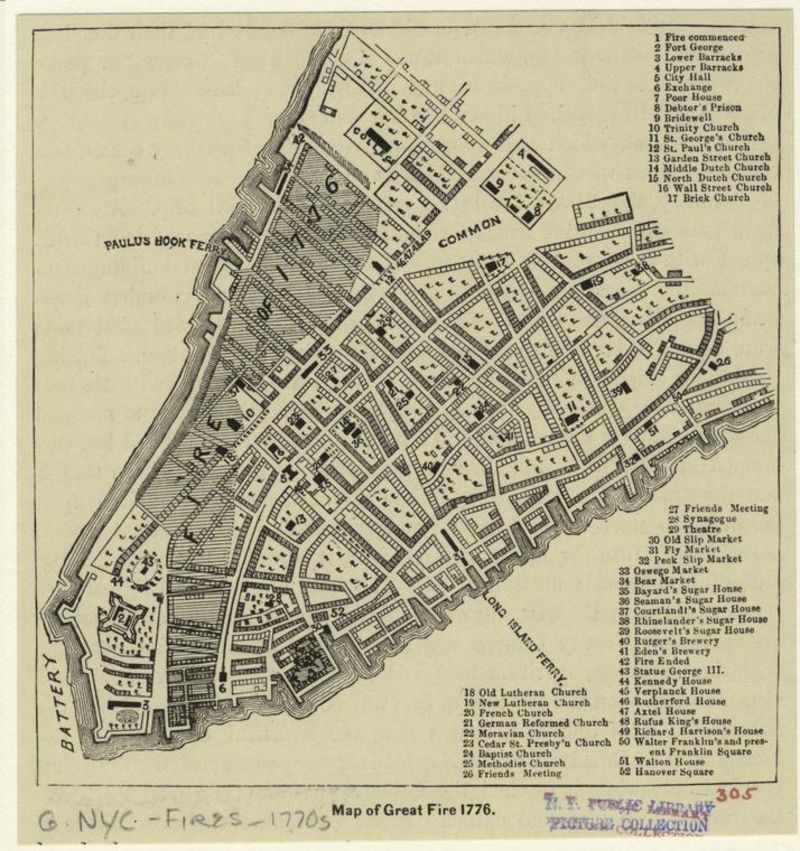 [7] Mercantile Library Association, New York City during the American Revolution (New York: Mercantile Library Association, 1861), 126 n7; Philander D. Chase, “Grim, David (1737–1826), tavern keeper, merchant, and antiquarian,” American National Biography, Feb. 1, 2000 (Accessed 22 May. 2020) (“antiquarian”); an engraving of David Grim’s map showing the extent of the fire, by George Hayward, was widely reproduced after its initial publication in Valentine, “Great Fires” (1866), opp. p. 766. See also Clifton Hood, “An Unusable Past: Urban Elites, New York City’s Evacuation Day, and the Transformations of Memory Culture,” Journal of Social History 37, 4 (summer 2004): 883–913. On “formulas of banalization,” see Michel-Rolph Trouillot, Silencing the Past: Power and the Production of History (Boston: Beacon, 1995), esp. pp. 26, 83, 96 (quote), 97, 102–7, 147–48.