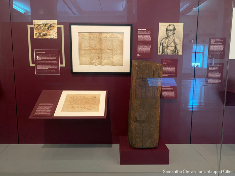 Within the Castello Plan, New Yorkers can see present-day New York City streets that belonged to the original Dutch street grid. The grid of Lower Manhattan is New York City’s largest landmark. A 3D version of the map in the exhibit allows viewers to Zoom in and walk the streets, passing by some of the 300 houses, landmarks like Fort Amsterdam and City Hall, canals, windmills, and farms. You can walk the streets of the Castello Plan while tracking down relics of the colony on Untapped New York’s Remnants of New Amsterdam walking tour!