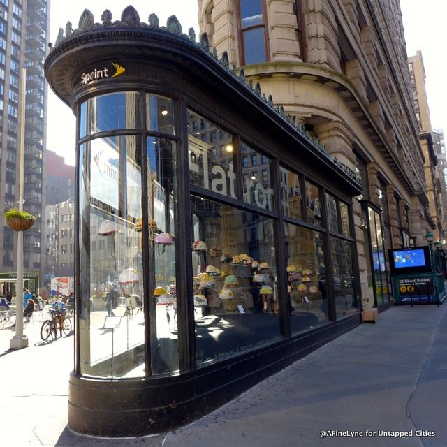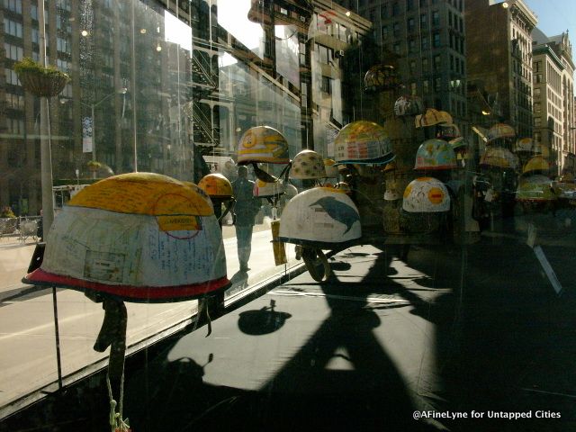 Facing the Flatiron Building, you are drawn to the latest Flatiron Prow Art Space exhibit. 50 steel helmets from the Vietnam war, covered in photos and notes taken from war correspondents. Cindy Kane (the artist) noted that “Soldiers are our boots on the ground, but journalists are our eyes on the ground.” and so the exhibit is named Eyes on the Ground. A thoughtful exhibit, beautifully curated by Cheryl McGinnis.