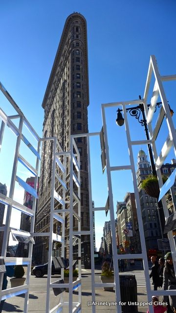 The winner – INABA, a Brooklyn based company specializing in concept development, creation and design. Their winning piece named New York Light is the result of a collaboration between the INABA, bengal.ferro, Tillotson Design Associates, Robert Silman Associates, Walsh Electrical Contracting, Inc.,, DLC International Lights, Crestron, Bartco Lighting and Naho Kubota. The installation frames the Flatiron Building and at the same time, opens up to the Empire State Building to the North. Standing within the panels, we can see partial reflections of all that surround the installation.