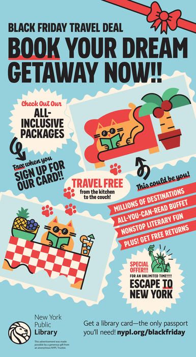 The New York Public Library is known for its annual tongue-in-cheek Black Friday ads that promote free books and 100% off coupons. This year, the library is offering to help you “Book Your Dream Getaway.” This can’t miss “Black Friday travel deal” is an “all-inclusive package” packed with “millions of destinations” and an “all-you-can-read buffet.” The best part is, you can “travel free from the kitchen to the couch” without worrying about any travel restrictions. The only passport you need to take advantage of these unbelievable deals is a library card because of course, you’ll be traveling via books!