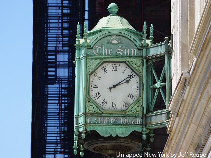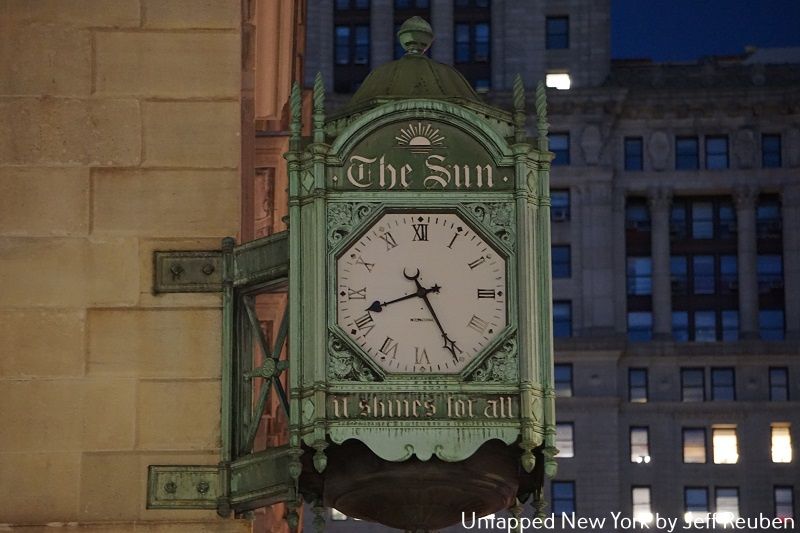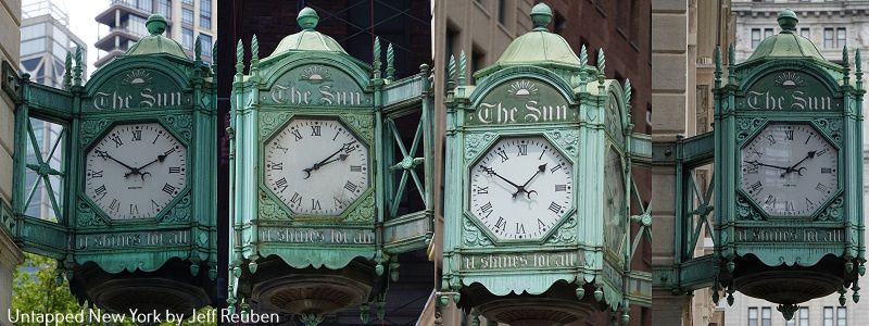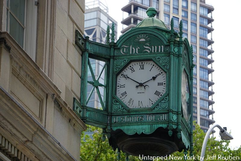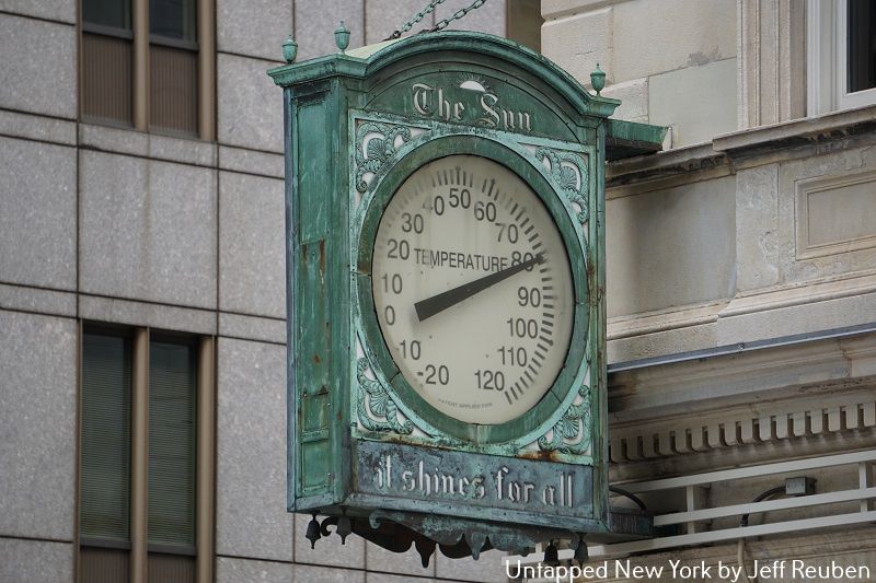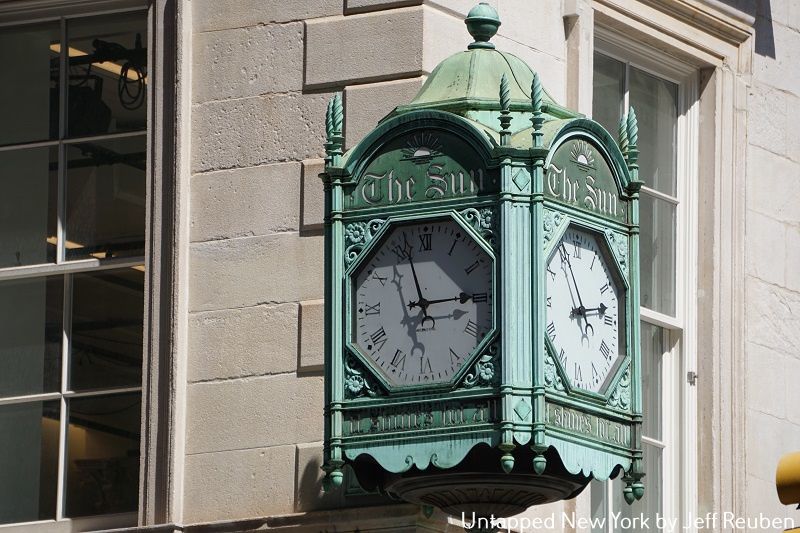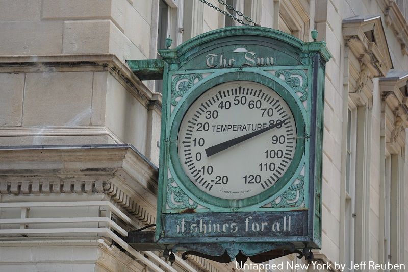 New York City’s landmark designation report and the National Register nomination form for the building offer no substantive details about the clock and thermometer, apart from the obvious: that they were installed by The Sun. Although the trail went cold on the official history front, a clue to the clock’s origins is hiding in plain sight.