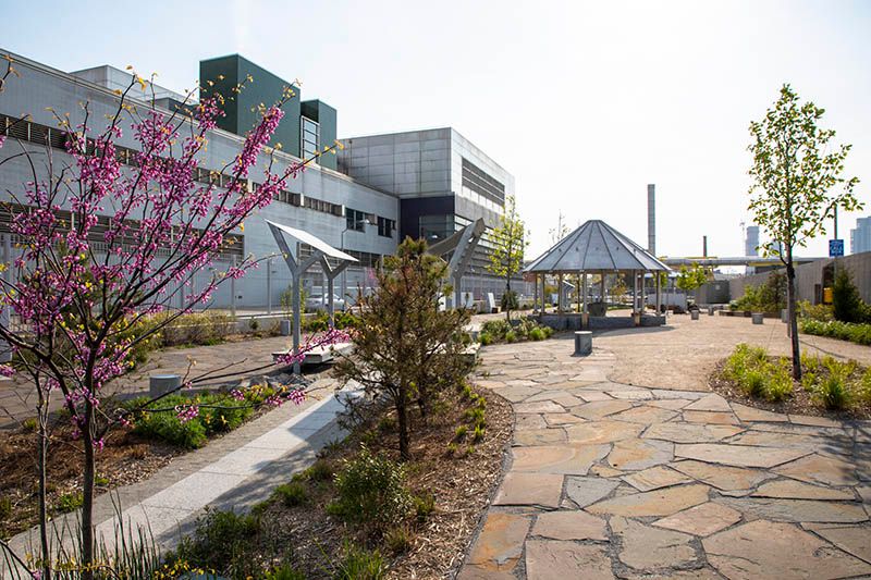 The Newtown Creek Nature Walk is planted with native trees, shrubs and other flora, to revive a long-inaccessible industrial shoreline for public use as a waterfront promenade. The walk features a 170-foot-long “Vessel” passage to the waterfront evoking the angled timber construction of ships once built along the East River. The walk also features nine 12-inch-thick granite slab steps that ascend out of Newtown Creek, each with scientific names etched on them to trace the evolution of the Earth through geologic and biologic eras that include forms of life native to Newtown Creek and Greenpoint. While there, check out seven stone circles, etched at various angles with local, native place names used by the Lenape help visitors visualize the places they identify. Another noteworthy feature is a 1,400-pound granite table in the shape of a shipping bollard, the cylindrical posts used to secure ships in port. The table also features an etching of Newtown Creek’s original watershed.
