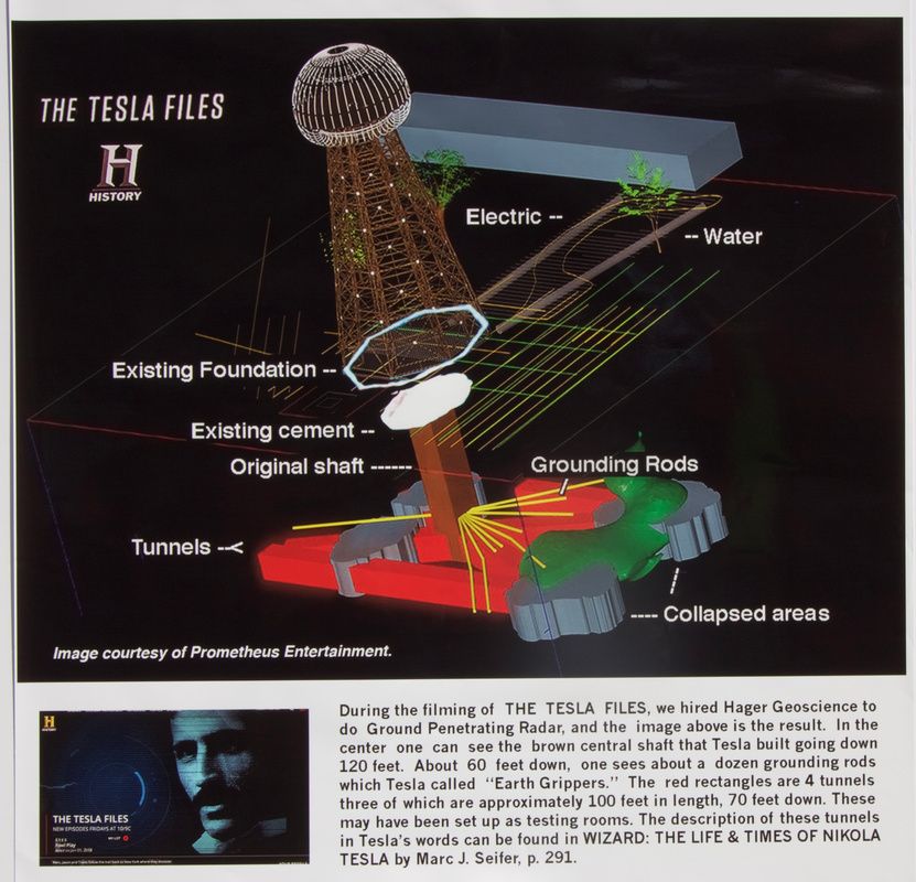 For decades, a mystery has persisted as to what may lie beneath the base of Tesla’s tower. Many believed that below the surface there is a maze of hidden tunnels and chambers. At the Tesla Birthday Expo, Alcorn revealed findings from a ground-penetrating radar scan conducted by The Tesla Files, a reality show on the History Channel that visited the site. After disclaiming that much of reality television is not in fact reality, Alcorn admitted that this finding was exciting and more accurate than inconclusive tests that had been conducted at the site by previous shoots.