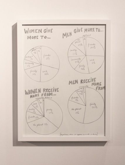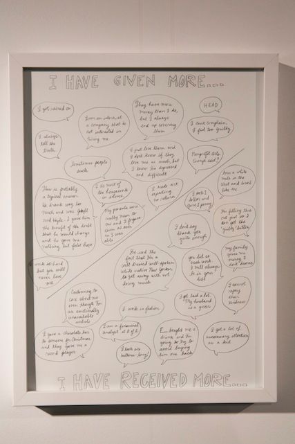 And it’s been really interesting to plot what people say based on their reported age. So there’s a lot of children, and one of the things that’s so great about working with No Longer Empty is how many children and teenagers… They do a lot of educational work, so way more than any other show I’ve done before, there’s an audience of young people. So I’ve been plotting at different points in people’s lives if they say they give more or receive more, and the children and teenagers are very honest—I would think it’s true that in general, if you’re seven years old, you haven’t given more than you’ve been given back. And so you can see that, and when it gets to about the thirties, it evens out and it seems like the forties are the most put-upon feeling. I’m in my forties, I can attest to that. Like, with the kid and the aging parents and the career being at a middle point. In the forties, people feel like they’re giving more than they’re getting back, but it’s still very split, it’s not overwhelming, but that’s the decade where most people are saying that they’re giving more, and then it kind of gets back even with older people. We actually had a couple of people in their eighties fill it out, which is exciting.