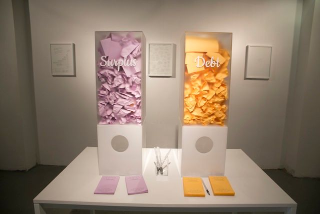 Untapped Cities is a proud media sponsor of No Longer Empty’s latest exhibition “How Much Do I Owe You?” at the abandoned Bank of Manhattan in Long Island City. Jennifer Dalton‘s piece ‘Reckoning’ asks viewers to fill out a survey explaining whether they have given more than they’ve taken or vice versa and then take a button that labels them as a ‘giver,’ ‘taker,’ etc. Over the course of the exhibition, Jennifer has been charting the responses as drawings that are displayed on the wall behind the receptacles. We had a chance to ask her about her experience as part of No Longer Empty.