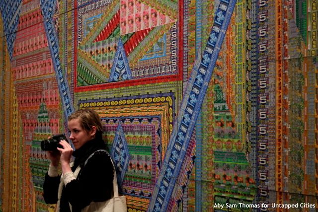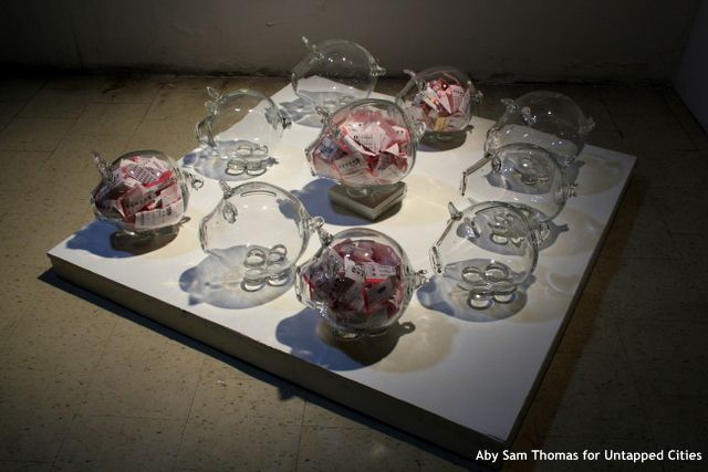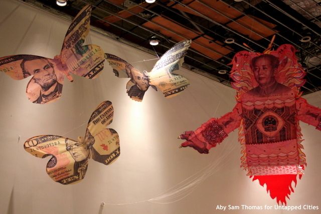 The setting for the discussion seemed oddly appropriate–we were seated in the former Bank of Manhattan building, surrounded by artworks that were related, in some way or the other, to money and its connection to society. Large kites made out of currencies loomed over the audience, with the dispassionate faces of Mao and Lincoln looking down on us. On the wall behind us, the colorful collage made out of scratch-off lottery tickets was a beautiful distraction. The huge bank vault downstairs was awesome, but so were the installations around it, especially the hissing serpents clad in business suits.