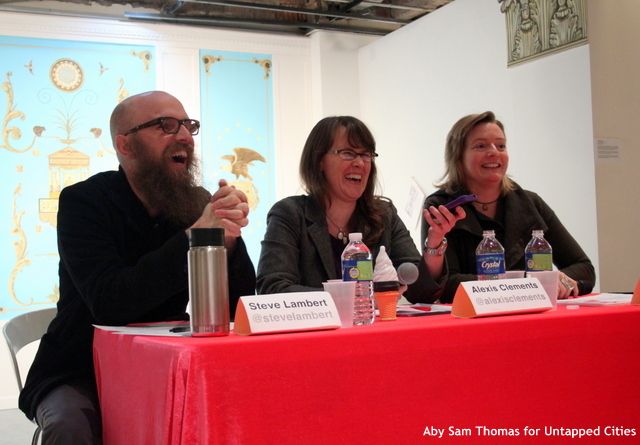 It was in these striking surroundings that Steve Lambert, visual artist and the co-founder of the Center of Artistic Activism, Alexis Clements, writer and fellow at the Cultural Strategies Initiative, and Deborah Fisher, executive director of A Blade of Grass, debated on the topic of arts funding and how it affects artists in today’s world. The discussion, which was hosted by Flux Factory, was moderated by the non-profit art collective’s Christina Vassallo and Douglas Paulson, both of whom held a tight rein on the proceedings by wielding aids including “smackdown” cards, sputtering fog machines and more.