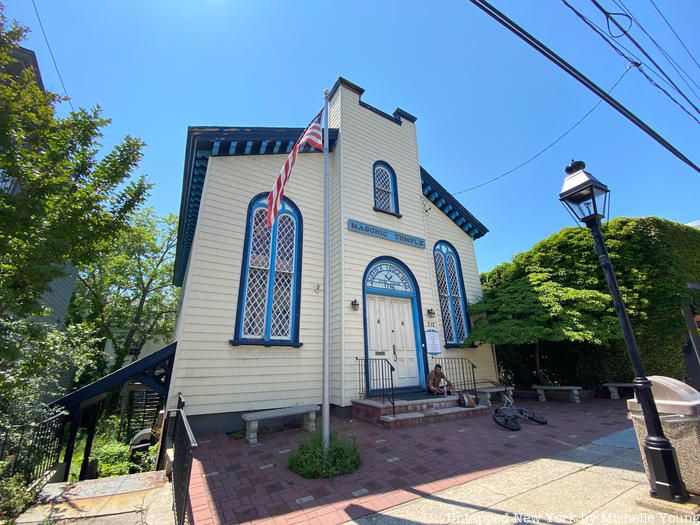 Lodge No. 60 suspended operations from 1826 to 1856, and meetings were held under lodge number 401 instead of the original 60; the number 60 was restored in 1876. Lodge No. 60 purchased the nearby Presbyterian Church in 1910, and after considerable remodeling, the first meeting was held in the church in 1912. The “Masonic Temple” is a light-yellow building with dark and light blue windows, blending in with the outdoor garden outside the lodge.