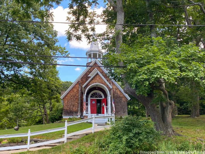 All Souls Episcopal Church, previously named St. James Church, is a historic chapel on the east side of Main Street next to the Stony Brook Village Center. It was designed by notable architect Stanford White, a partner in the architectural firm McKim, Mead & White and architect behind the Washington Square Arch, the second Madison Square Garden, and more. The church was built in 1889 with a gabled roof, octagonal bell tower, and an open arcaded porch. The church also features a bright-red door and wooden frame, and it was added to the National Register of Historic Places in 2000.