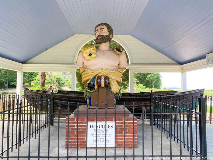 Overlooking Stony Brook Harbor just across from the Stony Brook Village Center, the Hercules Pavilion on Main Street houses the figurehead and anchor from the prestigious U.S.S. Ohio, the first ship launched from the Brooklyn Navy Yard in 1820. Although the U.S.S. Ohio was destroyed and sunk in Greenport, Suffolk County, the massive bust of Hercules was saved and originally sold for $10 to the Aldrich family of Aquebogue. Ward Melville later acquired the bust in 1954 for preservation, and it is said that if you kiss the brow of Hercules, you’ll be married within a year.