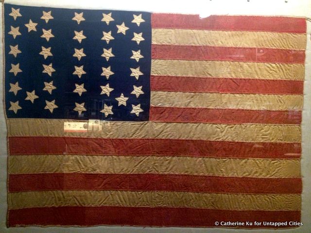 The easiest way to see the collection is using a map created specifically for the exhibit at the information desk, since the objects aren’t gathered together in one place. They range from the everyday–a wooden canteen and spurs–to the commemorative–preserved laurel leaves from Lincoln’s coffin and an American flag with 34 stars to include the newly-added slave-free Kansas.