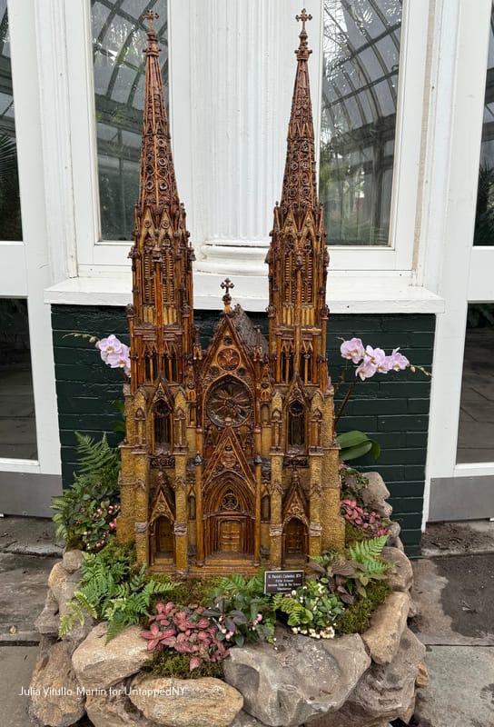 Poe Cottage is far plainer than the magnificent building that Busse replicated next: St. Patrick's Cathedral in Manhattan. Busse's botanical St. Pat's looks remarkably like the real one standing majestically on Fifth Avenue. Designed by James Renwick, Jr., one of the nineteenth century's finest architects, St. Patrick’s is the largest Neo-Gothic Roman Catholic cathedral in the country. Dolan, who now heads Applied Imagination, says she isn't sure why her father chose St. Patrick's as his first major botanical building. But she notes that one huge plus in addition to its fame is its sumptuously decorated facade.