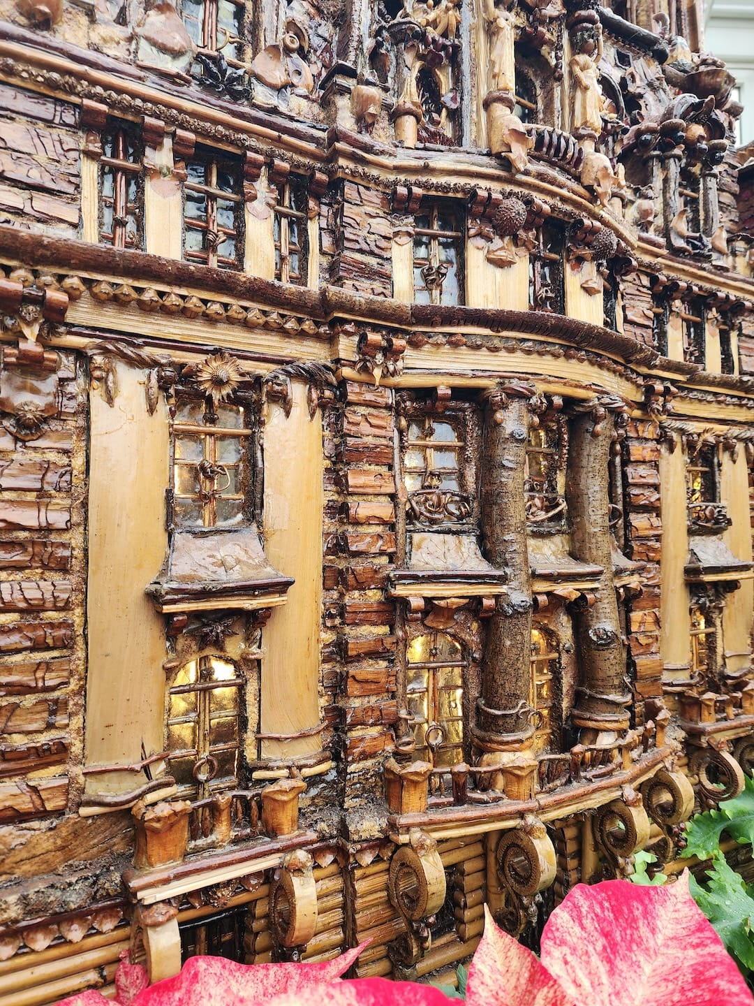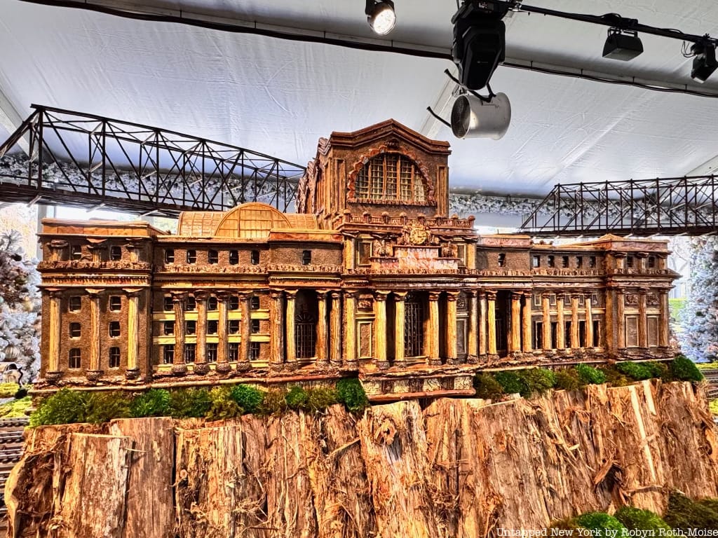 While Clark's roughly $190 million abode was built with Italian marble, oak from the Sherwood Forest of England, and stone from his own quarry in New Hampshire, the replica at the Botanical Garden was carefully crafted out of cinnamon bark curls, pine cone scales, acorn caps, star anise, pistachio nut shells, twigs, palm fronds, and more plant materials. It is one of nearly 200 replicas of New York City structures currently on display at the Holiday Train Show®.