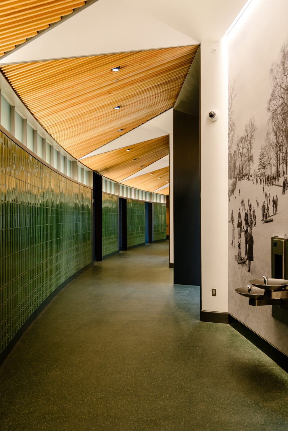 The new facility is tucked into a hill and blends seamlessly into the lush landscape of the North Woods with a green roof that offers panoramic views of the Harlem Meer. The eight-acre site boasts an expansive lawn that can transform into an ice rink or a pool depending on the season. Shiny new locker rooms, restrooms, and room for events can be found inside the LEED Gold Certified building.