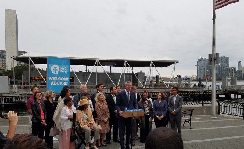 Mayor Bill de Blasio and community leaders at launch of NYC Ferry’s Astoria route. Photo courtesy NYCEDC.