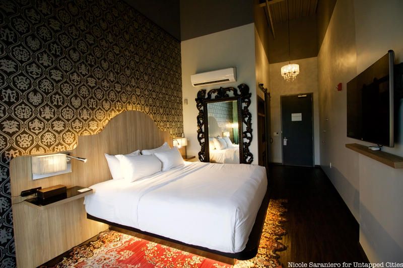 Outside the room, the edgy eclectic style is carried out through the rest of the hotel with large pieces of artwork like a glittery portrait of Mick Jagger in the lobby by artist Russel Young, and colorful decorative accents such as custom designed rugs with hidden skulls weaved into the design. Lining the walls of the hallways and accenting the rooms you will find striking Rorschach test patterned wall paper. There are a host of amenties at the hotel to enjoy such as a relaxing outdoor pool deck, free wi-fi, complimentary continental breakfast, and access to BV’s Grill by Bobby Van’s, an off-shoot of the famed steakhouses of New York City.
