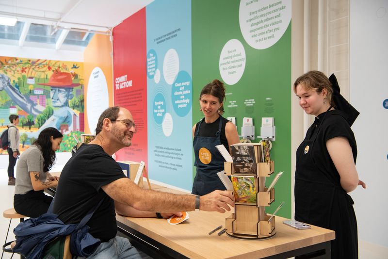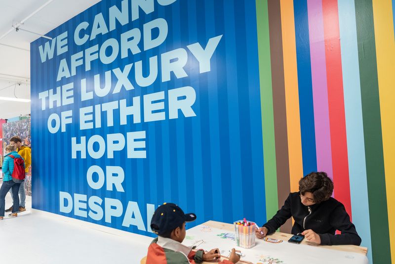 Miranda: The thing I have to call out here is our Action Station. I think this is one of the most important things that we do and something that distinguishes us from a lot of cultural institutions. We provide our visitors with very clear guidance and suggestions on specific, high-impact climate justice actions they can take and then invite them to make a commitment in a way that allows them to see, over time, the sticker wall will become plastered with stickers. It starts blank and at the end, it’s like a fungal network in a forest. I was worried people were going to start covering the art. It was awesome. People, by putting stickers up here, start to see they’re part of a broad community that supports action for climate justice. And that is, if there’s one thing that we exist to do, it’s to mobilize arts and cultural work to help people see their own power to take meaningful action. And that happens at this wall. There’s a really great one that went up the very first day. There’s a lot that I love here but there’s one that says, “I will hope and fight.” I love that. That’s a great combination. Hope alone is a bit passive. We have that big quote up front that says, we cannot afford the luxury of either hope or despair. And in one version of hope, I 100% think that’s right. Because it’s all about the fight. It’s about we have to make this fight. And frankly, we have to make it not knowing what the outcome will be. We’re not guaranteed a victory. That’s always true in any big, important fight. The outcome is not guaranteed, but the fact of making the fight gives you hope. It gives the people around you hope, and it makes a just future possible.