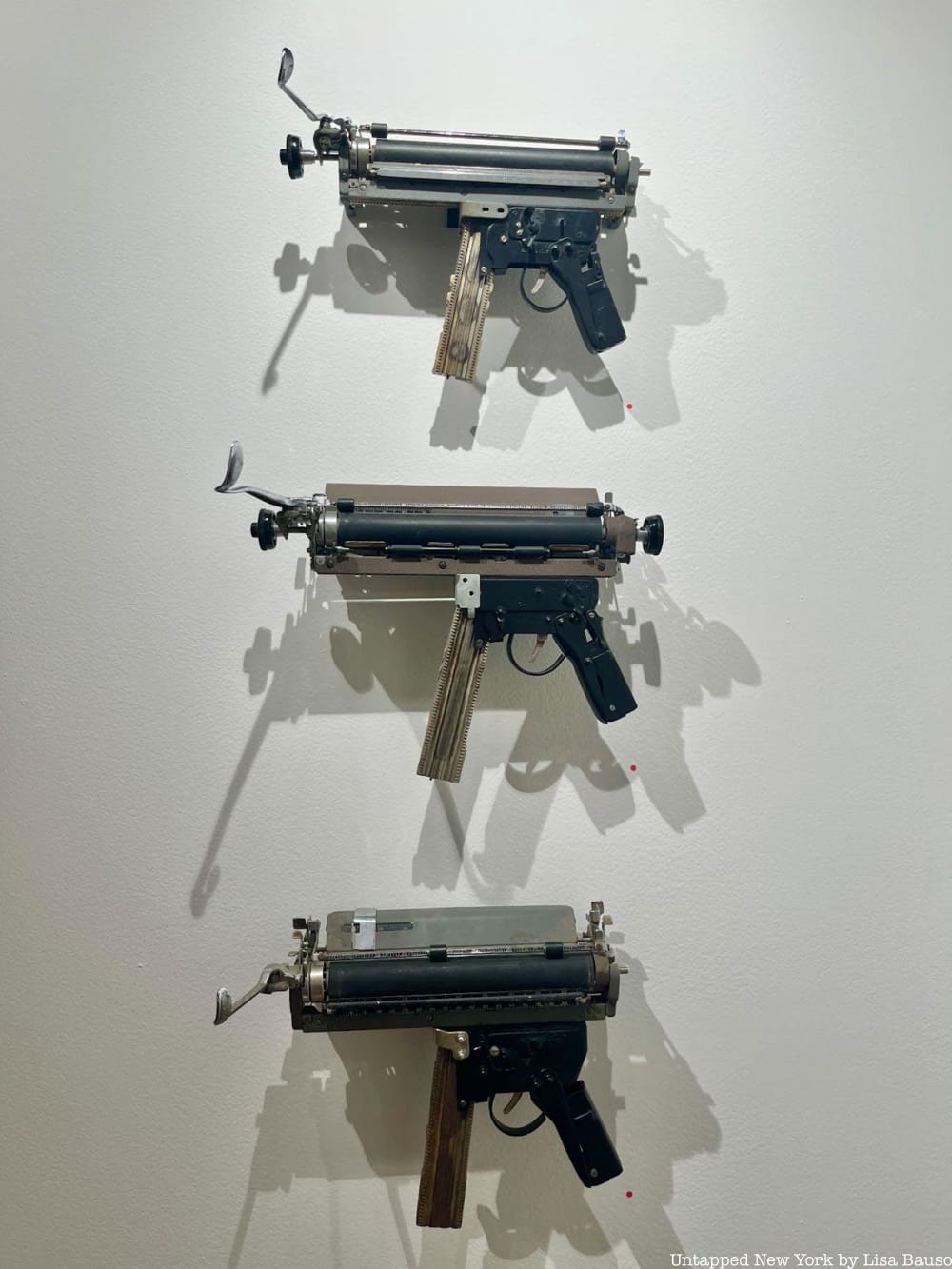 (Left) Harmon Projects, NYC. Ravi Zupa, typewriter guns, 2023, typewriter components, stapler components, wood. (Right) Harmon Projects, NYC. Alison Friend, Pet Portraits.