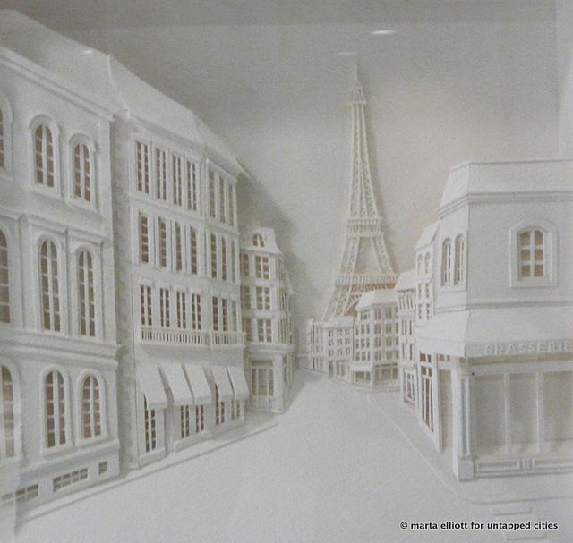 Surprised that’s paper? We were too when we checked out artist Christina Lihan’s free exhibit “Constructions” at the Citigroup Center at 53rd Street and Lexington Avenue in New York City. Lihan, of Lihan Studio, creates replicas of famous buildings, bridges, and cityscapes by hand-cutting paper. She doesn’t paint them, but uses the thickness of watercolor paper to make these 3-dimensional. Lihan patiently cuts, folds, and forms every detail of a building to create these scenes that put architecture in a new light.