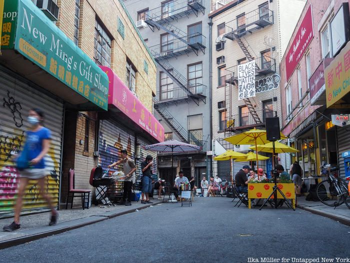 NYC’s new combined Open Restaurants and Open Streets in effect on Doyers Street this weekend.