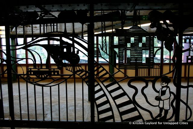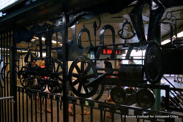 Several stops southwest at Woodside — 61st Street, I found Dimitri Gerakaris’s Woodside Continuum (1999). Here the artist shaped the metal bars of the “control area” to reflect the Woodside neighborhood and its historic relationship with public transportation, creating sightlines that reach from the viewer to the station to the community around it.