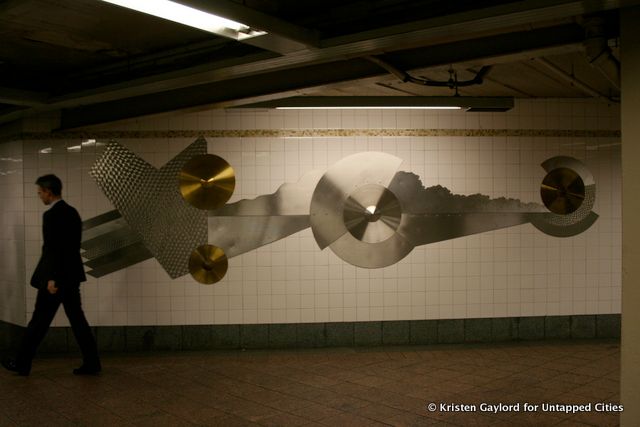 Along the “home stretch,” as it were, lie three major New York subway stations, including 42nd Street – Grand Central. Although the terminal above is one of the most photographed and iconic sites in NYC, there is art underground, as well. Dan Sinclair created two assemblages called Fast Track and Speedwheels (1990), emphasizing the hustle and bustle of this transportation center as well as the mechanics of the trains. The shapes are familiar–futuristic yet retro, a combination of art deco and steam punk–and mimic the grinding gears only yards away that keep this city’s 8 million people moving.